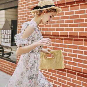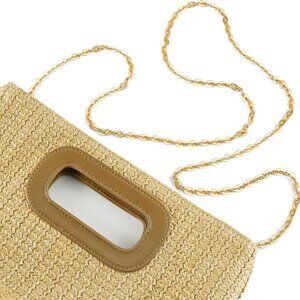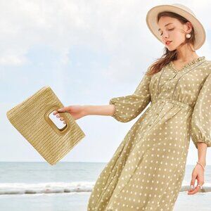 Features: This spacious straw clutch is made of handwoven raffia, offering a luxe, textured look that’s scratch-free. It easily fits your phone, keys, lipstick, and more, making it a must-have for summer outings or beach days. The secure magnetic closure keeps your belongings safe, while the detachable shoulder strap (drop length: 23.6 inches) makes it super versatile—wear it by hand, on your shoulder, or crossbody.