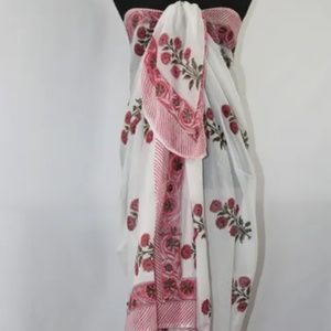Versatile Floral India Print 100% Cotton Fabric. May be used as Sarongs, Beach Cover-Ups, Dresses, Skirts, Scarves, tablecloths, runners or throws. Beautiful colors, white background with brown, pink floral hand block print. 46.5 X 74.5 Inches. Only 1 available. Sarongs are from my online website new retail inventory