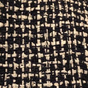 There are so many possibilities for this every ready, hardworking blazer by Koret. It has a collarless V neck, with 3 button closure at low hip length. Fully lined in “True Navy” acetate. The cream and navy loose weave has avoided shading pixelation with over-weaving in a thinner navy, which straddles casual contemporary and classical woven textures. The looser weave lends itself to a comfortable drape, but the softened box style says structure. I look forward to wearing both jeans and slacks with this go anywhere style!