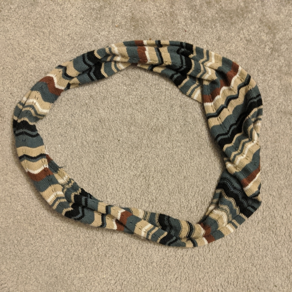 Infinity scarf that goes with almost any outfit; gray, brown, black, tan, and white.