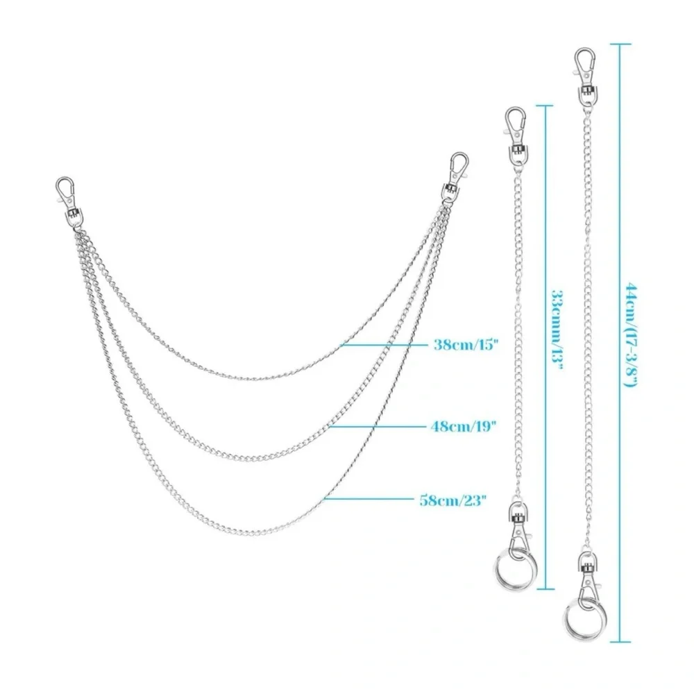 Elegant silver chain for wallets or bags or belts and pocket chain. Features multiple clasps for versatile attachment.3 piece set