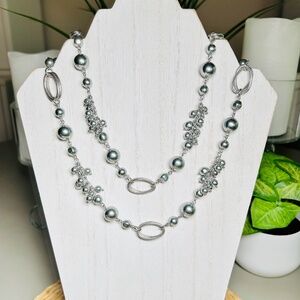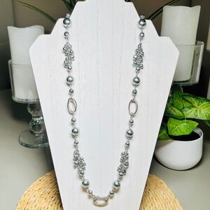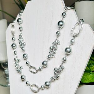 Versatile Talbots Long Slate Gray Faux Pearl Cluster Necklace, textured silver tone oval chain links.