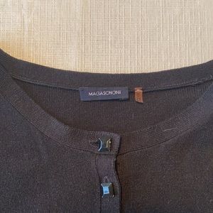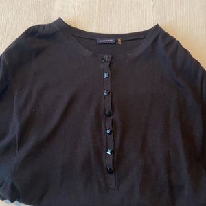 This top is comfortable and versatile. It has short sleeves on a bell like style. It isn’t firm fitting but come in at the waist. It has pretty button details that unbutton.