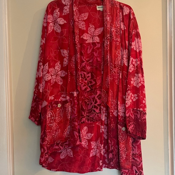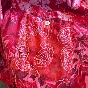Beautifully patterned jacket can be worn as a bathing suit cover up or a topper for cool days in sunny weather. Excellent condition with pockets!