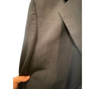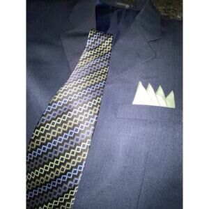 The Versini Blue Suit is a classic 2-piece ensemble perfect for various occasions such as travel, parties, casual wear, and business settings. Made from 100% polyester with a wool lining, this suit features a stylish four-button jacket with a notch lapel and single vented design. The suit comes with a striped tie by Kilburne & Finch, adding a touch of Italian theme to the overall look. With a chest size of 48 inches and a waist size of 44 inches, this suit in size 42R offers a timeless and elegant style for any season.