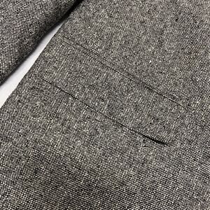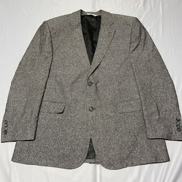 Gently used. No rips tears or stains. Has extra buttons in the pockets. Nice boucle' fabric makes this an outstanding sport coat. Tweed look. Two flap pockets on outside are unopened. Straight away chest pocket is fake. Inside has 2 besom pockets. Single vent. Please, see all photos for more details as they are part of my description. Comes from smoke and pet free studio. Approximate measurements are laying flat