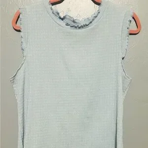 This Versona tank top features a sleeveless design with a ruffled neckline and ribbed texture, all in a classic blue hue. Perfect for warm weather, its soft material and casual style make it a versatile addition to any wardrobe.