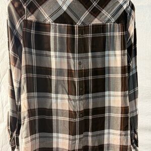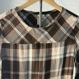 This Versona blouse features a chic boxy style in a soothing cream and brown palette. Designed without a collar, it offers a modern and versatile look. The blouse's relaxed fit makes it perfect for both casual and semi-formal occasions.