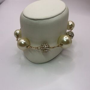 This exquisite bracelet showcases faux creamy pearls paired with intricate gold-toned beads, creating a timeless and elegant look. The alternating pattern of pearls and ornate metalwork adds a touch of vintage charm, making it a perfect accessory for any occasion. Its neutral color palette ensures versatility, complementing a wide range of outfits. 10 inches in length.
