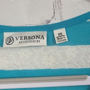Versona XS Turquoise Rosette Lace Stripe Tunic Blouse Sharkbite Hem Scoop SS Top