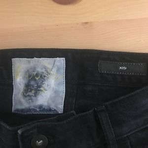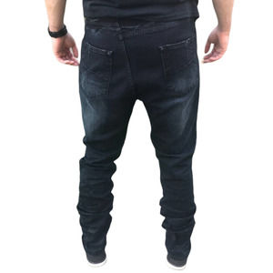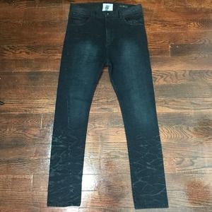 Men's Size 33. Style XOSP. Asymmetric construction. Deep drop crotch. Tapered long scrunched legs. Unique distressed patterns & intentional fading. Dark wash black / gray. Skinny leg style. Premium stretch artisanal denim. 98% cotton and 2% elastane.