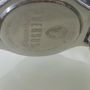 Elegant Versus Versace watch. Features a green dial with gold accents. Silver and gold-tone bracelet. Perfect for any occasion.