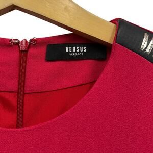 -Features: red body, short sleeves, mini length, black shoulder/sleeve stripe with shimmering “VERSUS” logos, back zip closure.