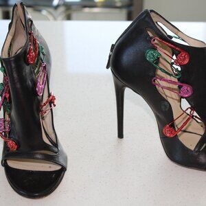 These well-loved Versus black heels are in decent condition, however some of the paper clips are popping off - these can most likely be repaired using some leather glue!