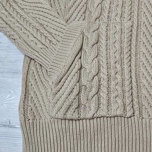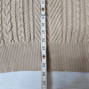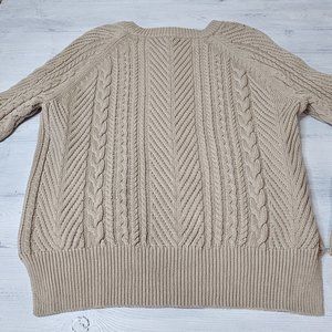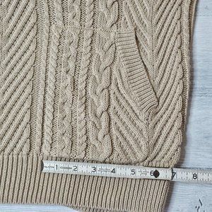Chunky, heavy cable knit sweater with two 'kangaroo' styled pockets (do not connect, referring to the shape) and is in EUC! Size X Large and the color is a neutral camel/cream/dark eggshell/light khaki. It has a crew neck and there are slits at the side seam hems. The sweater hangs a bit lower in the back than in the front, please see pictures.