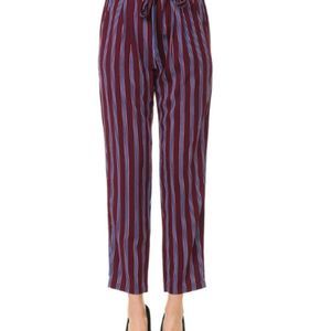 Pull-on pants in a multi-stripe print. Woven challis fabrication featuring a high paper-bag waistline.