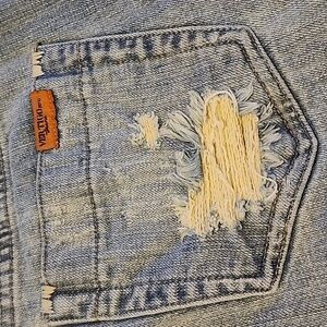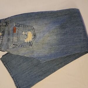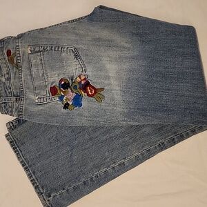 Authentic Y2K-era flare jeans by Vertigo, size 6. Classic late '90s/early 2000s style. These flare leg jeans feature bold, colorful floral embroidery on the back pocket, back waistband, front right pocket, back right calf, and slight distressing for that perfect vintage vibe cut in a light wash denim. Perfect for channeling vintage, boho, or festival vibes. Soft, mid-wash denim with a retro Y2K feel – perfect for festival looks or casual fits with a pop of personality.