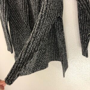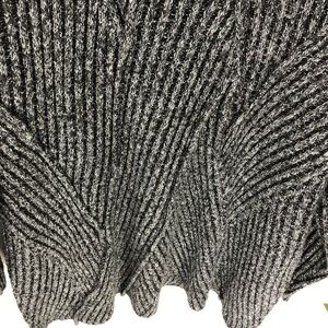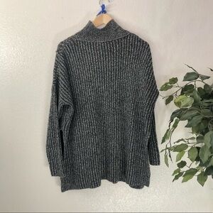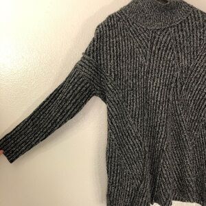 A heavy, knit sweater. Long sleeve with large slots up each side. Turtle neck sweater with line accents across on the front.
