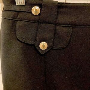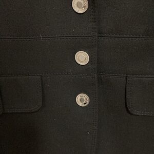 Vertigo Paris black skirt suit (2 pieces). Jacket has peak collar, 3 silver tone snap front closure, 2 faux pockets with snap closure, detail around the waist, light shoulder pads, fully lined & straight back. All hardware is silver tone and snaps are logo embossed.