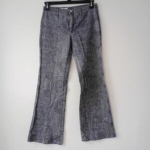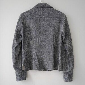 Designer two-piece denim set by Vertigo Paris featuring a patterned jacket and matching flared pants. The fabric has an intricate woven design with subtle metallic accents, creating a textured, elevated look. Can be worn as a coordinated set or styled separately.
