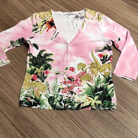 Elegant pink cardigan with vibrant floral design. Features button-up front. Perfect for layering.