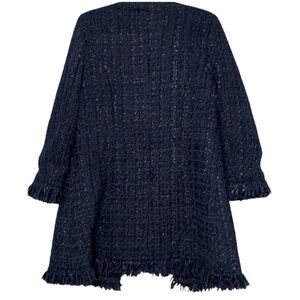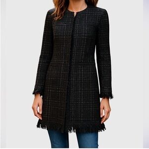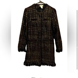 Stylish Wool blend black tweed coat with fringe trim accents. Fringe at bottom of coat, closures hook & latch, 4 welt front pockets, long sleeves with fringes at the end, black tweed coat infused with black iridescent threading which looks silver in the light. Length is 34"; armpit to armpit is 18"