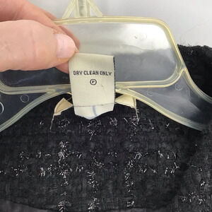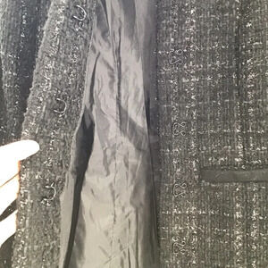 Nice Vertigo Paris Boucle’ Tweed fringed coat jacket. Lovely classic French couture style fringed coat. This is a black wool blend tweed with metallic accent threading. Features two front pockets, front hooks up front, l one sleeves & fully lined.