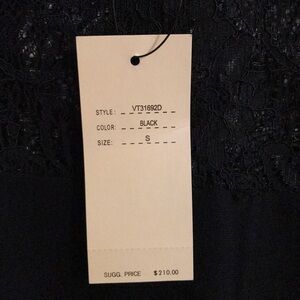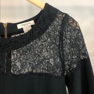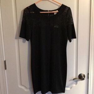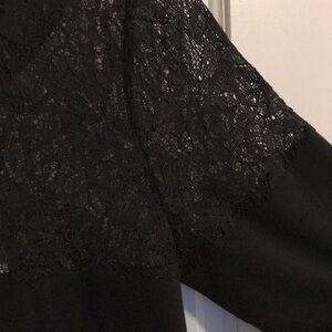 A gorgeous black dress with lace detail on chest and sleeves. Zipper back closure.