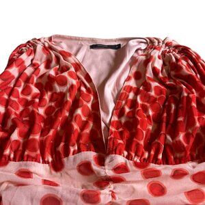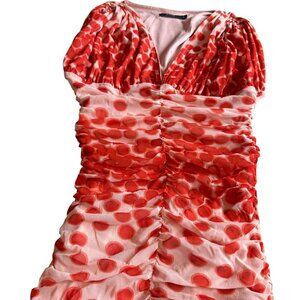 Vertigo Polka Dot Mesh Smocked Dress V-Neck Sleeveless Red Stretch Size Medium