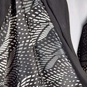 This Namaste Jersey Jacket has abstract pattern on the front in black white and gray. The balance of the garment is solid Black. It features raglan sleeves and a loosely fitted bias hemline with jersey bands. Open front with no closure. A perfect statement piece to your outfit.