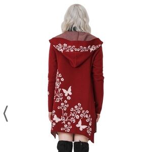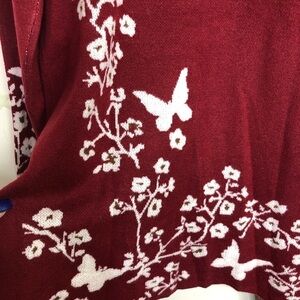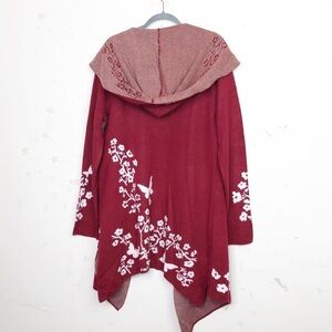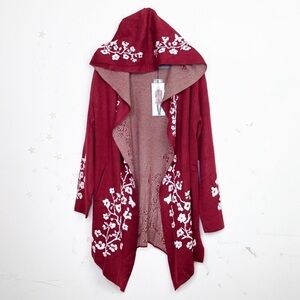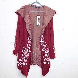 Vertigo burgundy & white floral hooded sweater coatigan duster with white floral flowers open closure, new with tag.