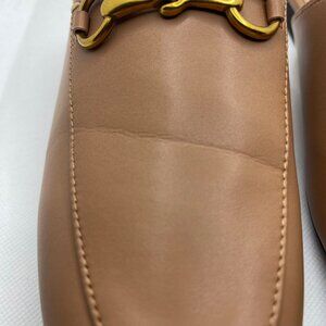 These elegant tan leather slip-on loafer mules feature a sophisticated gold buckle detail, adding a touch of luxury to any outfit. The cushioned insole ensures comfort for prolonged wear, while the durable outsole provides stability. Ideal for both casual and formal occasions, these mules are a versatile addition to your wardrobe.