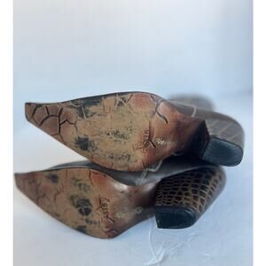 Embroidered, bronze stud accents. Pointed toe. Brown with a gold copper color. Zip up style closure.