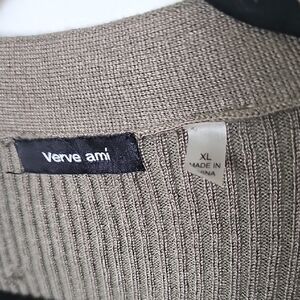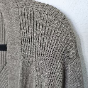 Cardigan from Verve Ami. Ideal for layering. Adds sophistication to any look. Has a long side split hem. Has a pointelle design in the back and front at the shoulders. Fabric does stretch. There are a couple of snags that I provided close up pictures of. There is also a stain in the front that is pictured. I have not tried to stain treat. Great for the office, workplace, career, casual, lounge, fall, autumn, transition, effortless. Ribbed at the wrist and bottom hem.