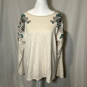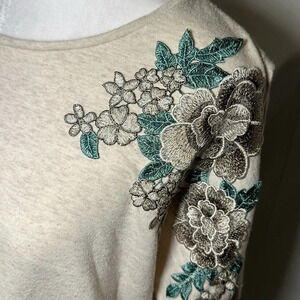 Verve amí floral cold shoulder sweater size medium. Beige body with turquoise / teal / green, cream, & taupe embroidered floral appliqués