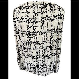Verve Ami keyhole front with tie top, long sleeves, elastic bottom, size L. Polyester spandex blend, ivory background with black design. Elastic neckline with keyhole and tie. Approximate measurements are pit to pit flat 25”, length from shoulder approximately 27”.
