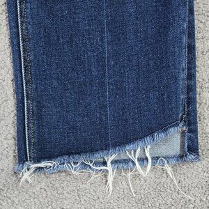Good used condition, with no stains or tears. Dark wash cropped jeans, with a subtle kick flare leg. Has whiskering and intentional fading. Has asymmetrical step raw hems which add interest. Stretchy. Has the classic 5 pocket jean design, and a zip fly/button closure.