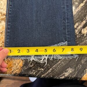 SIZE 27 - These Vervet Blue Step Kick Raw Hem Flare Cropped Jeans are precious! Dark wash cropped jeans, with a subtle kick flare leg. Asymmetrical raw hems, classic 5 pocket, zip fly/button closure. Approximate Measurements: waist across is about 14" Inseam is about 26 1/2", Length: 36", Leg Opening across is about 8", 85% Cotton, 21% Polyester, 12%Viscose, 2% Spandex.