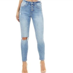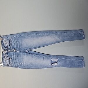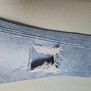 Button fly closure. Medium wash color. Stretchy fabric, exposed knee. There are some spots in the back on the butt that show more on camera than to the eye. I believe that is part of the distressing as I can see similar spots on the stock photo. weekend, hang out, school