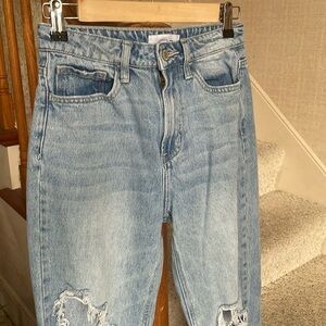 great pre loved condition size 25 light wash distressed denim jeans by Vervet, high rise, boot cut , super cute and trendy great pair of staple jeans