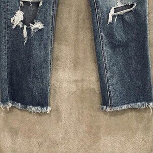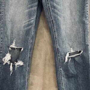 Condition: Good pre-owned condition. Features intentional distressing on both knees and raw, frayed hems. Some minor wear consistent with pre-owned, distressed styled jeans. No rips other than the intentional distressing shown in photos.