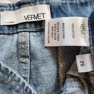 Vervet Mom Jean High Rise Paperbag Waist Belted Distressed Size 25. Mid blue wash. 100% Cotton, Intentional allover holes and distressing with fading throughout. Front zipper and button closure. Tapered leg and relaxed thigh. Self tie belt. Mom style jeans. Good used condition, don't see any holes or stains.