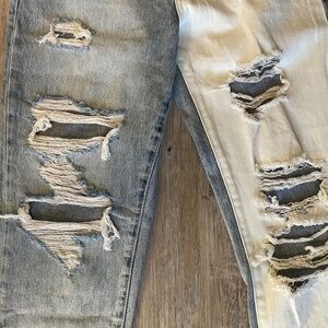 Super High-rise split two tone color blocked, cuffed mom jeans with distressed detail, and crop length