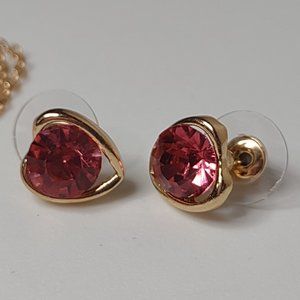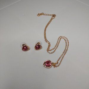 Very Cute Gold Tone Heart Necklace And Earring Set With Pink Stones