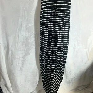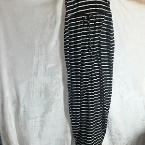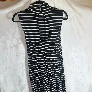Mock turtleneck Large keyhole back Has elastic waist Horizontal Stripes Button mock turtleneck Penguin Tail Hi-Lo bottom