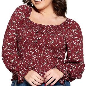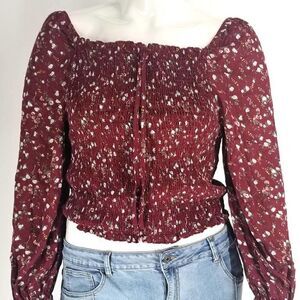 Burgundy Cottagecore/peasant style blouse. Smocked sleeves, dainty ruffle/lettuce hem on neckline and waist.