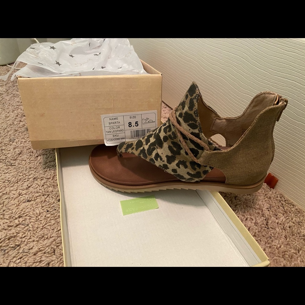 Leopard sandals. Size 8.5. NIB. Never been worn. I think they run 1/2 size too big in my opinion and from what other commenters posted from the boutique. Very G brand