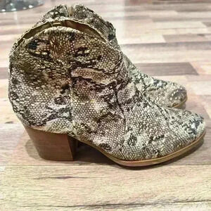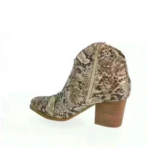 Very G Sprinkle Snake Skin Bling Booties! Snake skin print synthetic upper with gold bling mixed into the pattern. Featuring a western style ankle high shaft and zipper closure. Lightly cushioned footbed.