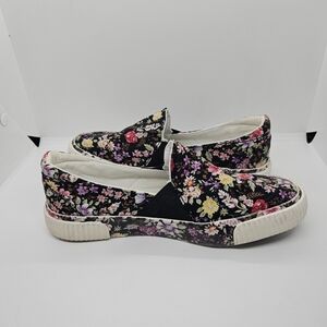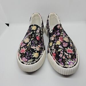 Floral slip on fabric sneakers with black goring, and floral and white midsoles.