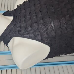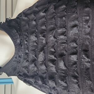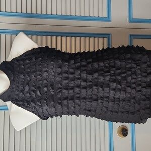 Make a statement with this stylish black halter top from Very Important Pieces. Featuring a unique textured ruffle design, this top adds a bold and sophisticated touch to any outfit. Made from a blend of polyester and spandex, it offers a comfortable, stretchy fit that's perfect for a night out or special occasions.